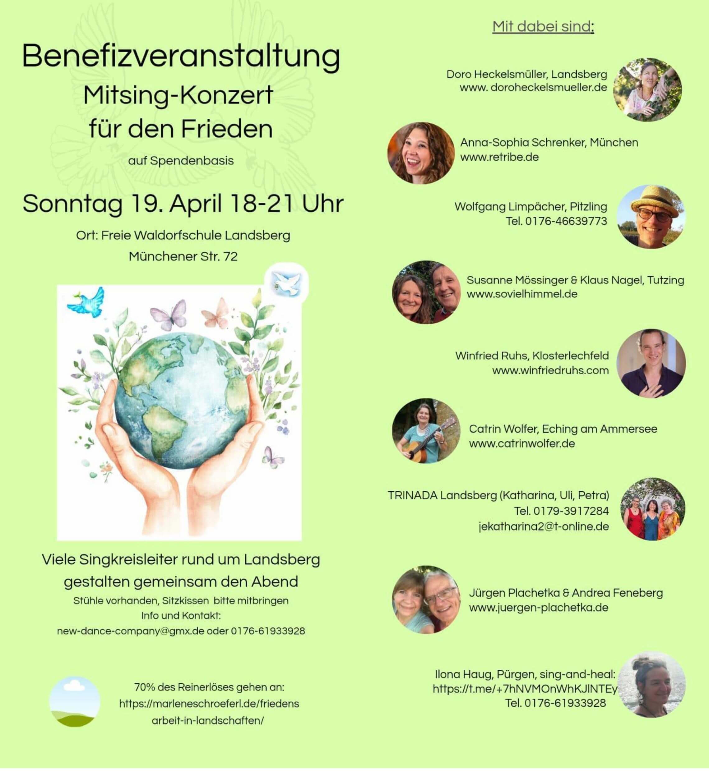 Am Sonntag, den 19.4.2026 findet von 18-21 Uhr in der Landsberger Waldorfschule (Münchener Str. 72) ein großes Mitsingkonzert auf Spendenbasis für den Frieden statt.
